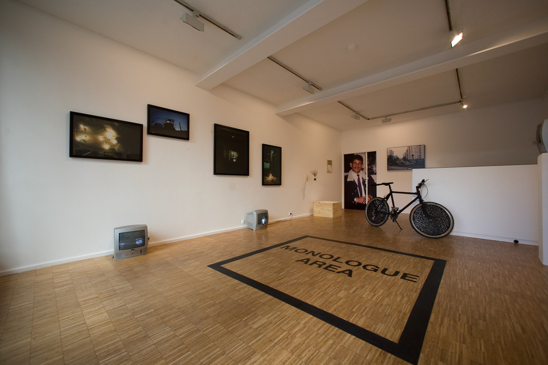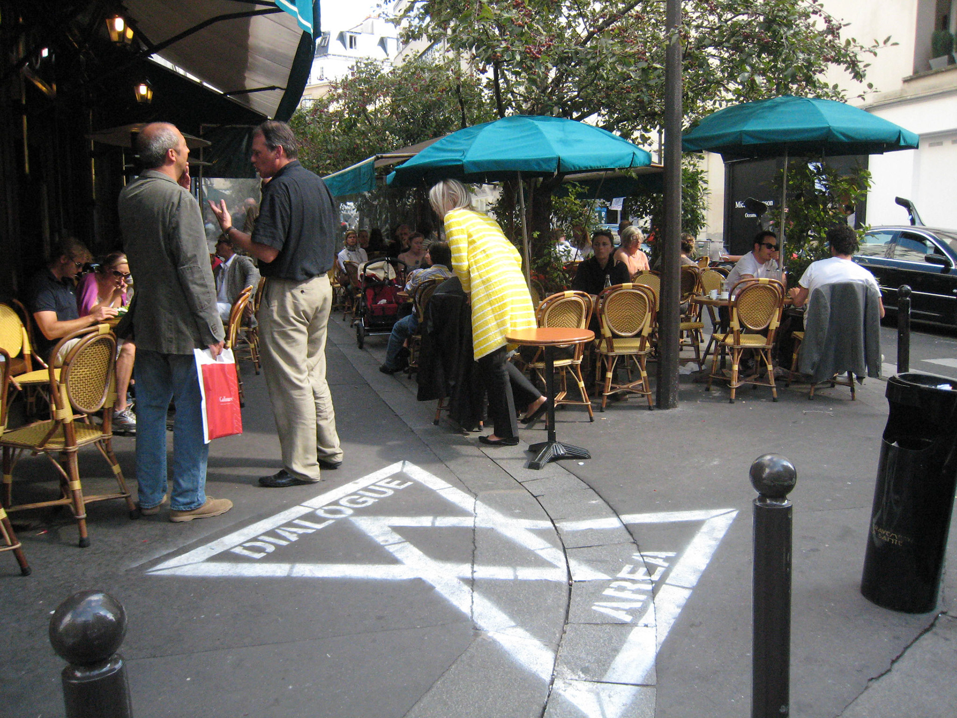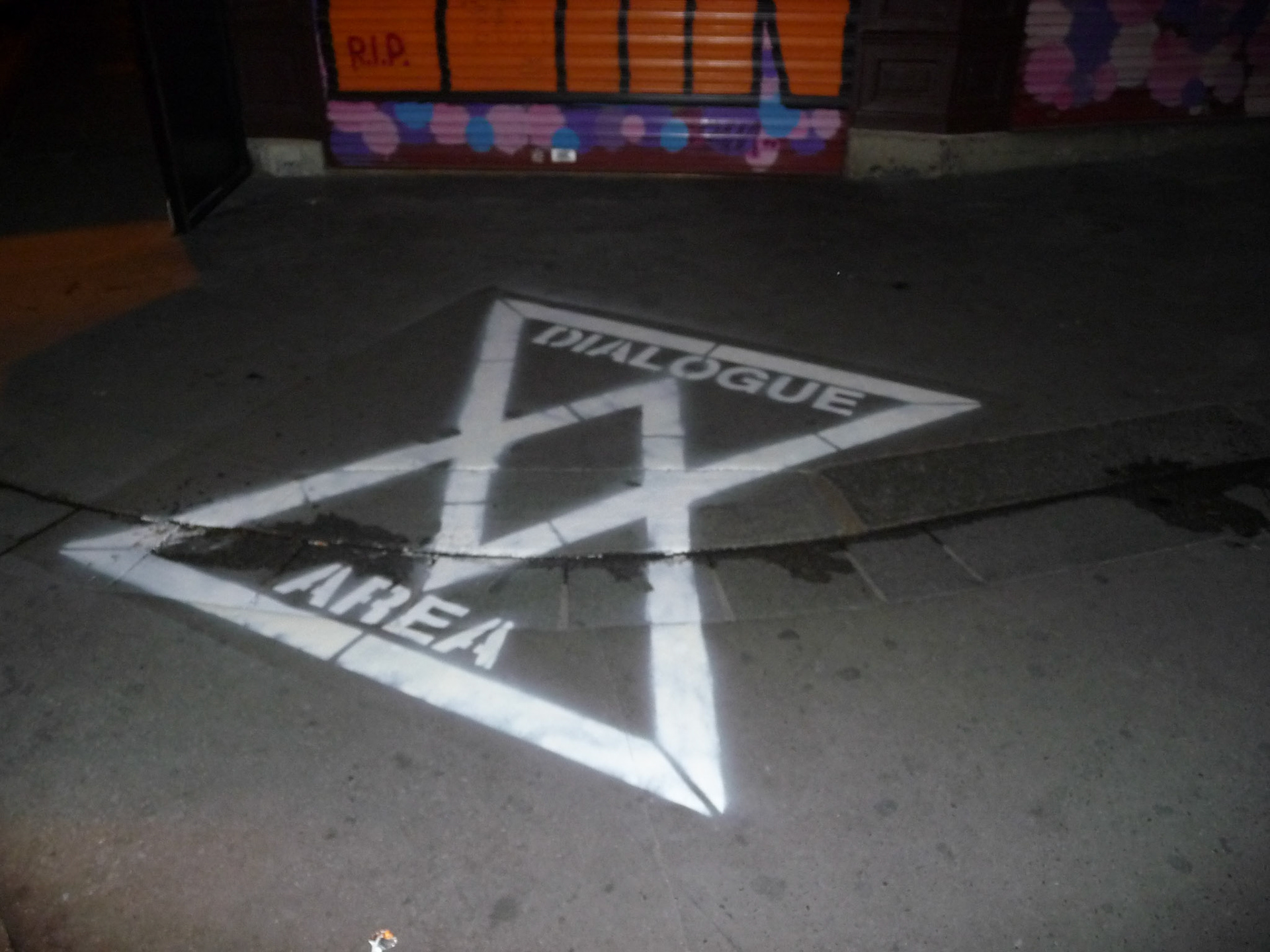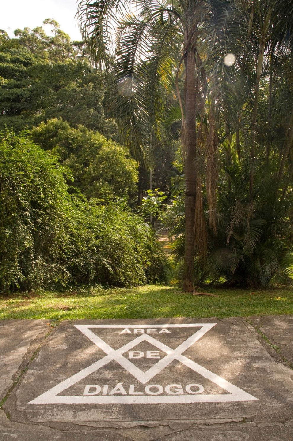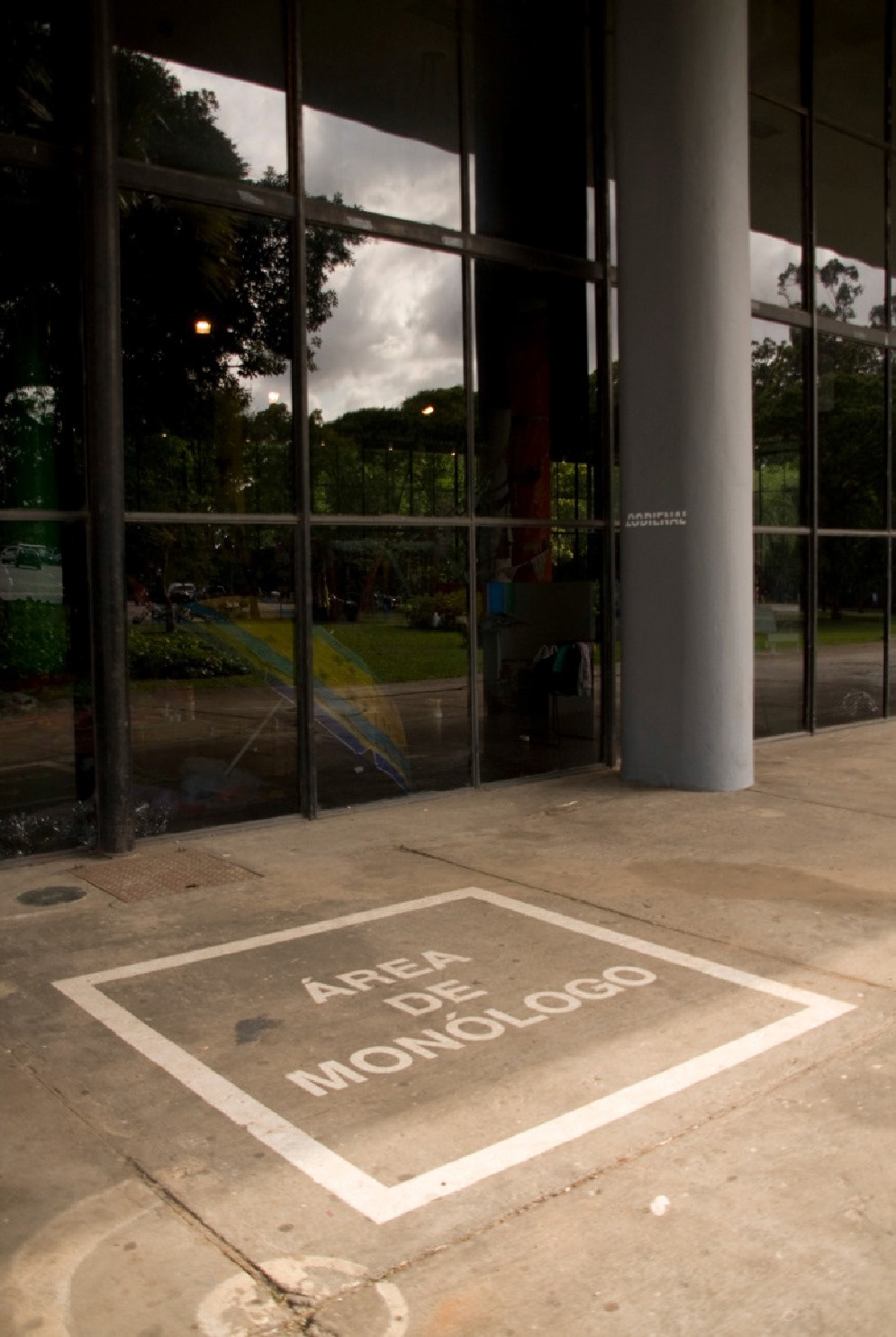 "Untitled (Silent Area, Monologue Area, Dialogue Area)" is an interventionist series commissioned for a group exhibition at GP & N Vallois Gallery in Paris, France, and the 28th São Paulo International Biennial, both in 2008. The drawings, created with acrylic paint or on laser-cut black vinyl, were displayed on the floor of the exhibition room as well as in public spaces surrounding the gallery and the biennial building. Visitors could step into these areas and use them at their discretion.