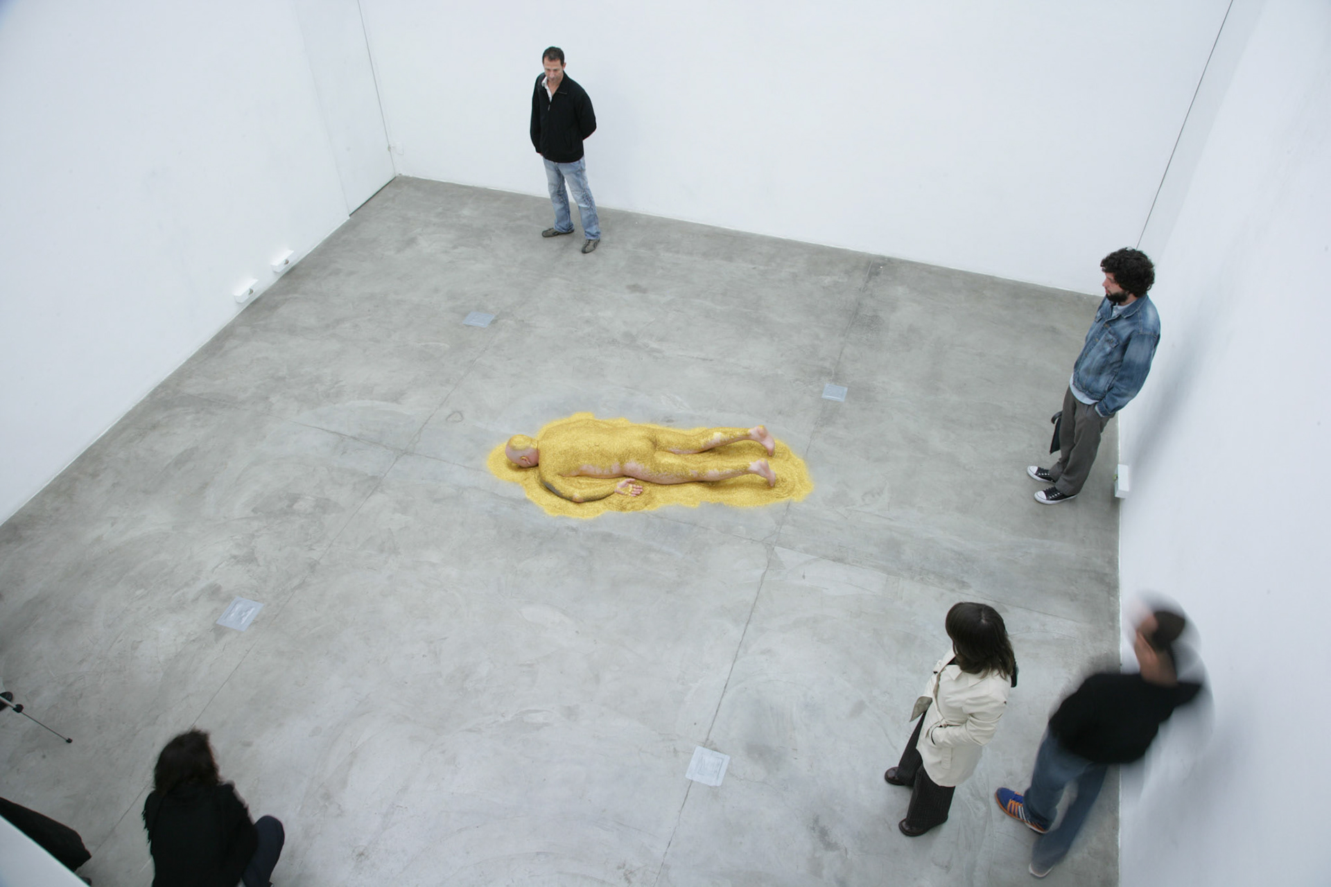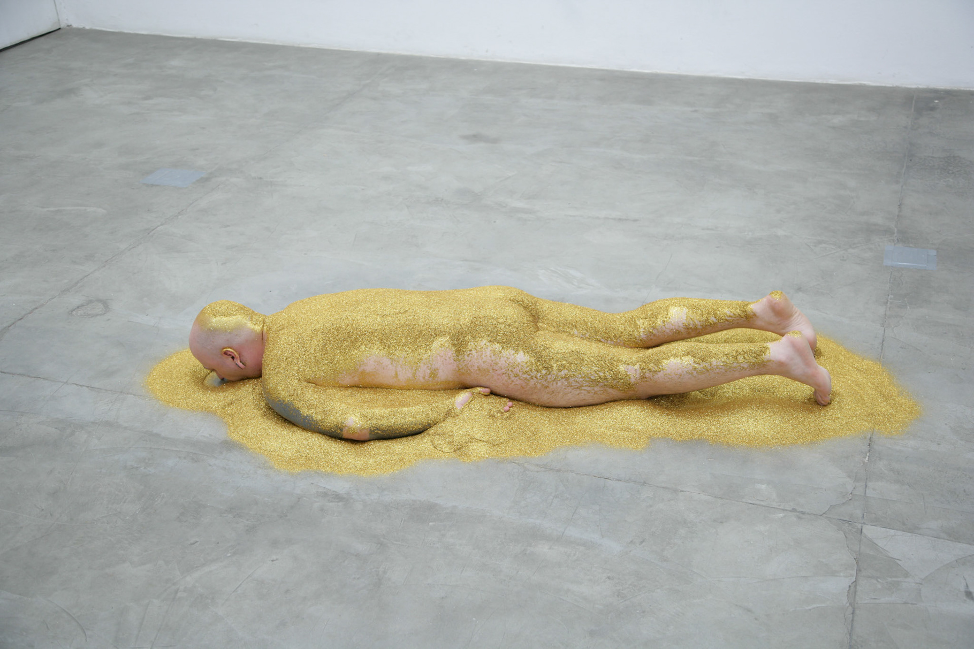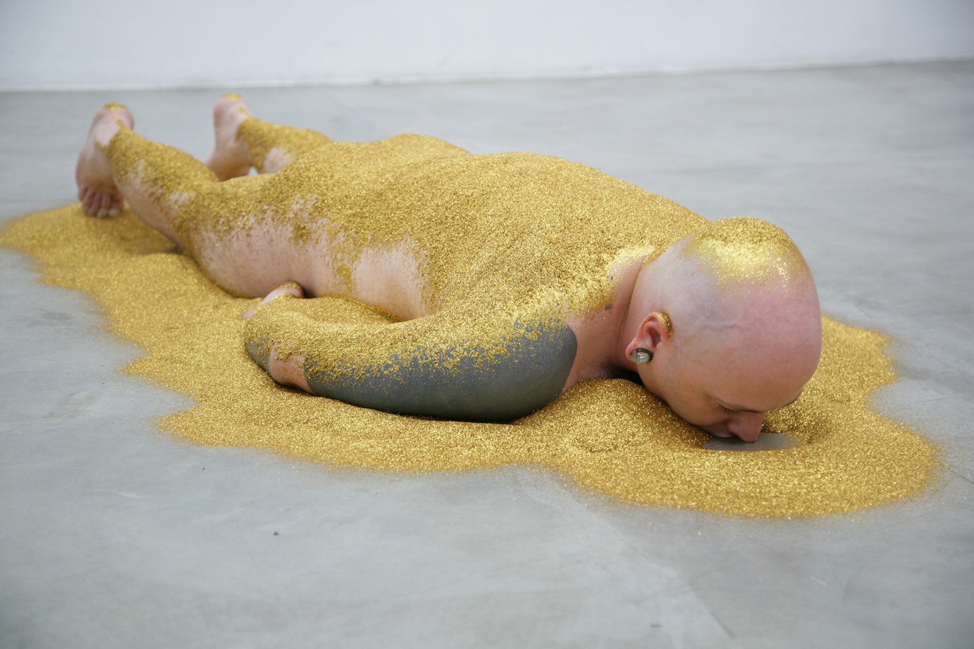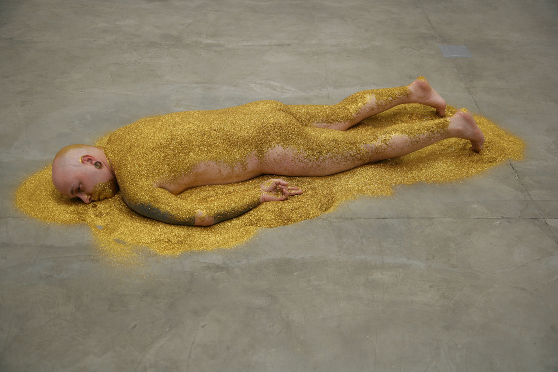 "Dead Zone" reflects on Brazilian colonial history, the relationship between European art and the exploitation of Brazilian natural resources. This piece, created with 30kg of golden glitter covering Ianês’ naked body, lasts for three hours, during which Ianês makes subtle, meaningless gestures with their hands.