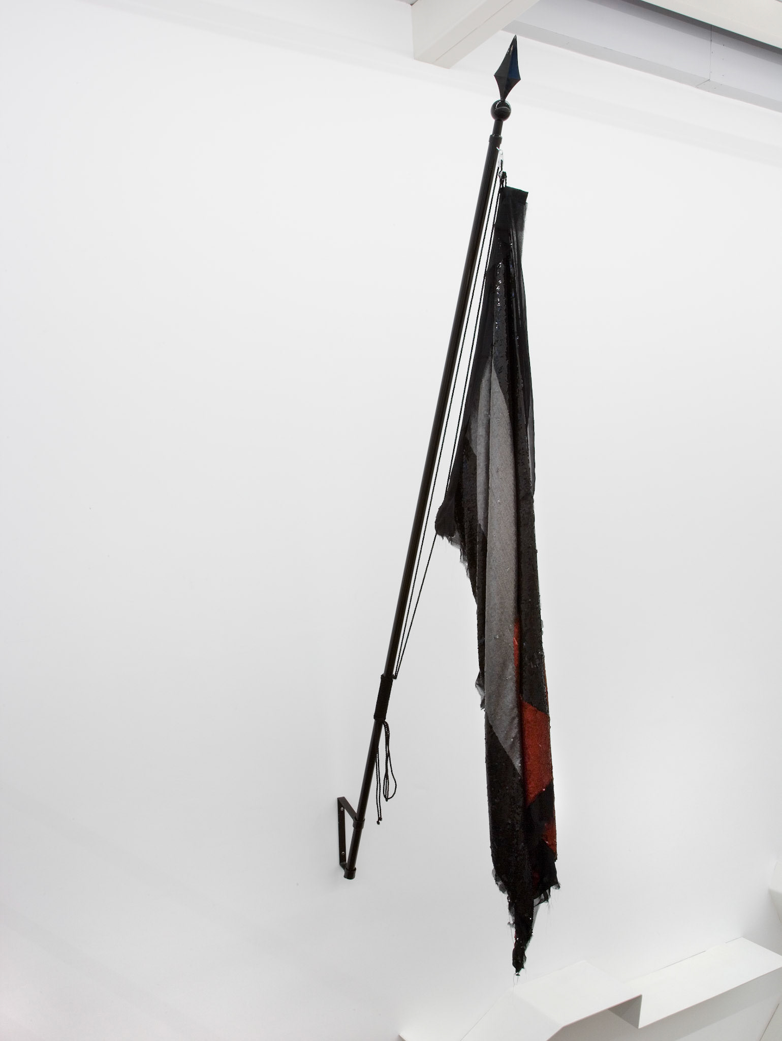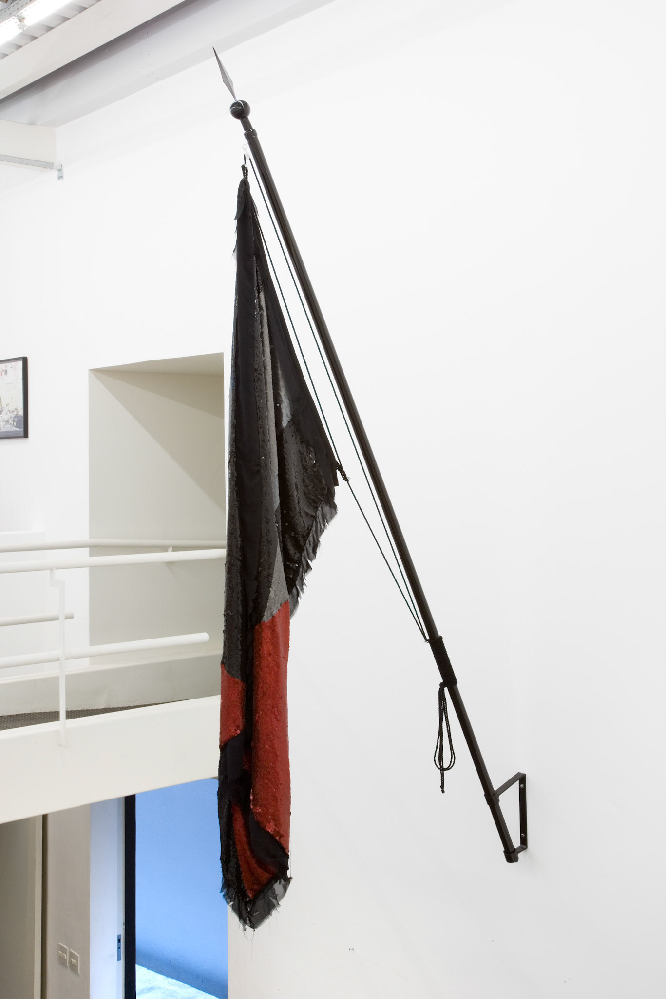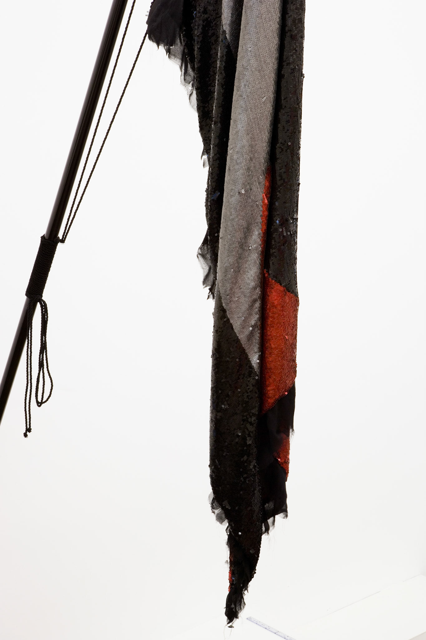 "Pátria (Motherland)" is a series of imagined flags made from frayed black silk and sequins, along with their corresponding flagpoles. They raise questions about the artificiality of the concept of a Nation State and transform materials traditionally linked to gendered, “feminine” and queer clothing (see-through silk and sequins) into a phallic object that is read through masculinity in its conception: the flag, a symbol of the abstract, artificial, unified power of a Nation State.