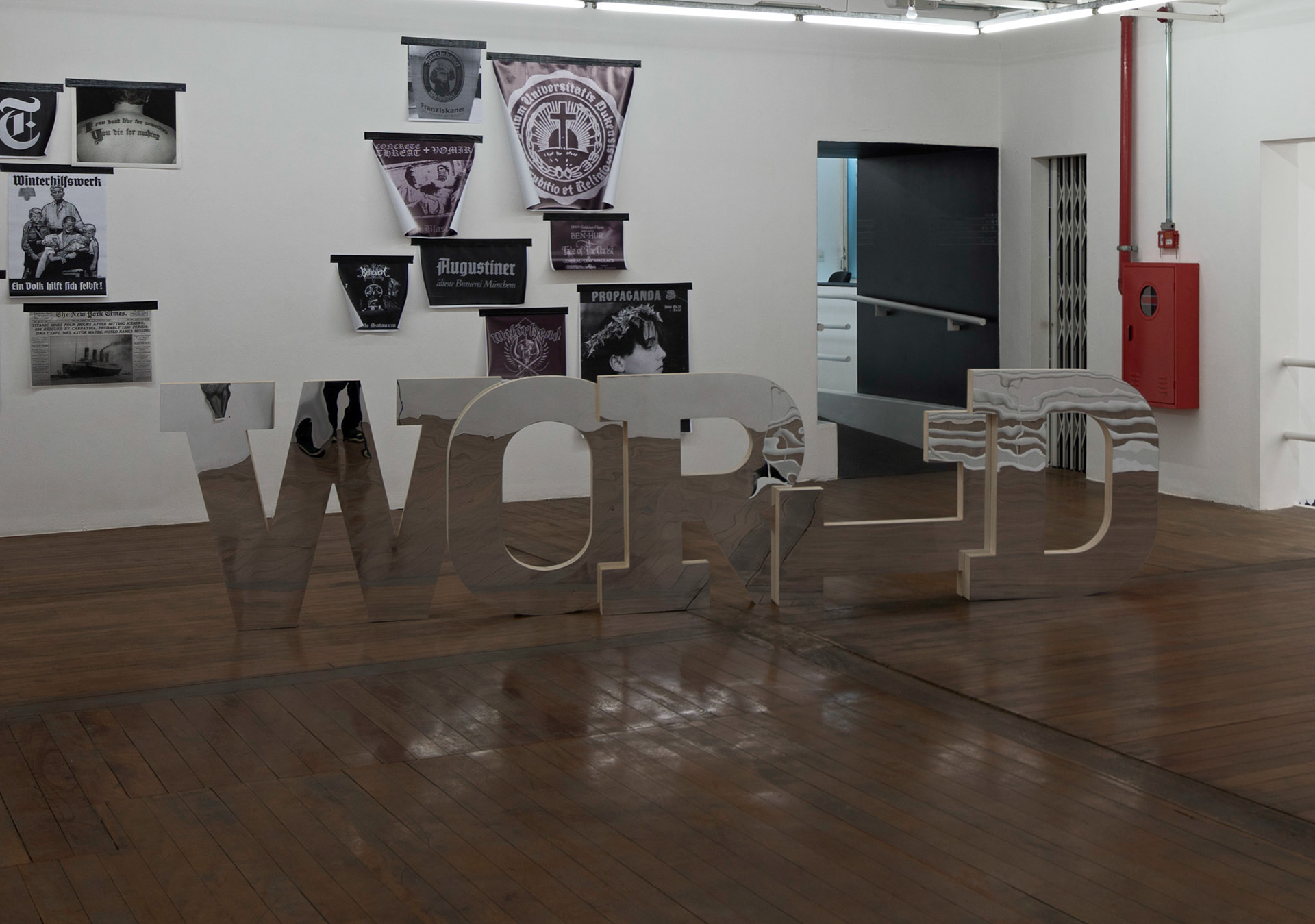 "Wor(L)d" is a sculpture whose front mirrored surface contrasts with its back, which is made with boards and fragments of cheap plywood, giving the piece the appearance of still being under construction.